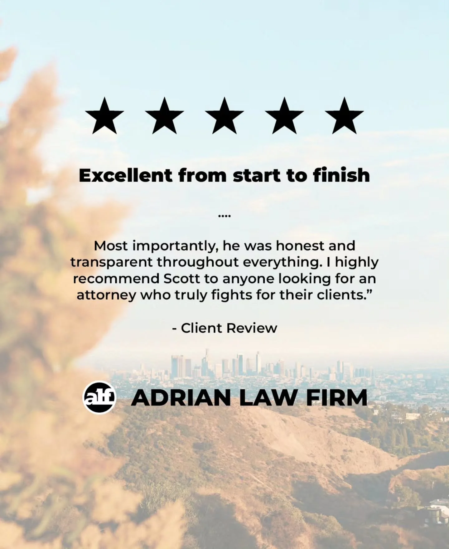 "If you or a loved one needs the best personal injury attorney, this is your guy! Sometimes accidents happen and we have a lot to recover for- but it shouldn't cost you everything including your time. Dealing with insurance and everyone involved comes with a lot of confusion and headache. With Scott - YOU ARE IN GOOD HANDS! I have nothing but high praises for Scott Adrian. Trustworthy, knowledgeable, efficient, quality and PROFESSIONAL! What a relief it is to have someone who listens and understands all your concerns. I couldn't recommend him more."